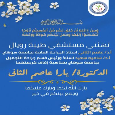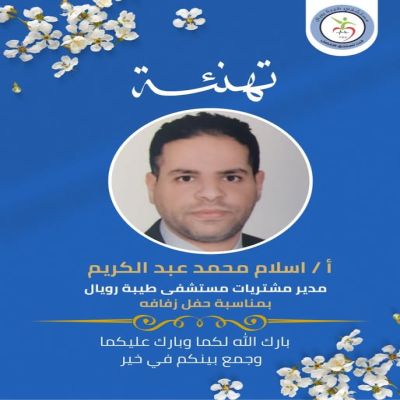 الاستاذ / اسلام محمد عبدالكريممدير المشترياتبمناسبة زفافهمع تمنياتنا له بالذرية الصالحة